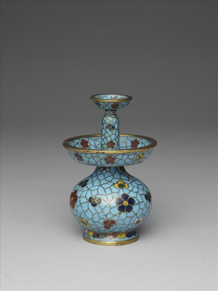 銅胎掐絲琺瑯燭台一對,由長筒型燭阡支座、承盤、瓶狀台座及圈足四部分組成。筒形座與承盤間以螺絲接合,燭阡由上方孔隙置入,以小托盤固定,以供插燭。由上而下各層之器沿與圈足俱鍍金,足底陰刻「康熙年製」無框雙行楷書款。此對燭台器身滿飾淺藍地掐絲琺瑯冰梅紋,圈足外壁飾以一圈卷雲紋,梅花瓣型隨器身部位有大小正側之變化,色澤與雲紋同為青、白、紅、黃四色,發色鮮明光潤,有如鑲嵌珠玉美石。