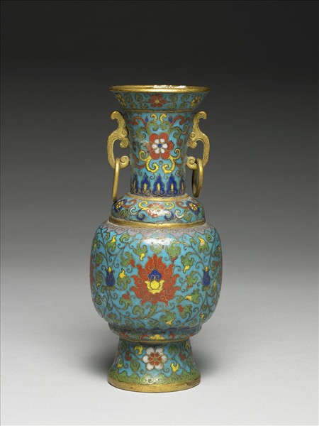 銅胎。侈口,直頸,豐肩,頸肩間凸棱,碩腹,高撇足,雙雲耳帶活環。器身藍地,以掐絲技法製作花紋,頸部花卉與蓮瓣紋,頸肩間凸棱飾轉枝花卉,腹壁以纏枝番蓮為主要紋飾,上下分別裝飾如意雲頭紋,足上花卉與如意雲頭紋。底外刻「乾隆年製」雙方框二行四字楷款。一般以燭台二、瓶二、香爐一同成五供,本器即五供的組成器之一。