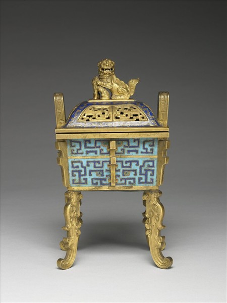 銅胎,形制如方鼎,立耳,四龍首足。蓋面有四梯形開光,開光透雕雲氣紋,隙地深藍地掐絲幾何紋。蓋上雕一獅蹲踞為鈕,該獅左前腳抓撫一小獅,小獅望向大獅,而正側身回首而望。腹上四角及中央棱脊,外壁以淺藍地掐絲獸面紋為飾。本器與他件瓶、盒共成「爐瓶盒三件」。