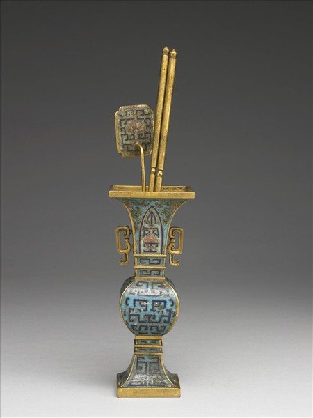 銅胎,仿青銅酒器方觚的形制。方形侈口,鼓腹,高撇足,雙雲耳。器身淺藍地,以掐絲技法製作花紋。頸部蕉葉紋,隙地轉枝花卉。腹壁獸面紋,足面有幾何化藍色紋,似由拐子龍紋變化而來,附香鏟一支、銅筷一對。本器與他件爐、盒共成「爐瓶盒三件」。