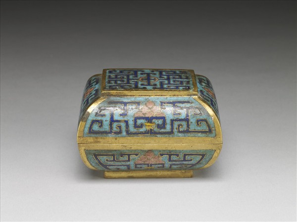 銅胎,方盒,弧壁,子母口,方足。整器外壁皆為淺藍地,以掐絲技法製作花紋。器壁四壁露胎框圍,框內淺藍地並飾深藍幾何化紋飾,似由拐子龍紋變化而來,中央並有類花瓣紋飾堆疊為山形,蓋面紋飾與器外壁相同,但蓋面除幾何化為飾外,蓋面中心則飾以粉紅色小圈。足露胎,本器與他件瓶、爐共成「爐瓶盒三件」。