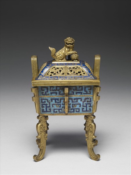 銅胎,形制如方鼎,立耳,四龍首足。蓋面有四梯形開光,開光透雕雲氣紋,隙地深藍地掐絲幾何紋。蓋上雕一獅蹲踞為鈕,該獅右前腳踏圓球,正側身回首而望。腹上四角及中央棱脊,外壁以淺藍地掐絲獸面紋為飾。本器與他件瓶、盒共成「爐瓶盒三件」。