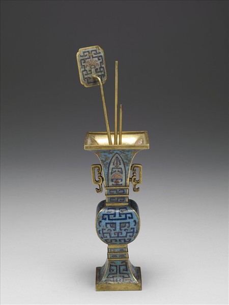 銅胎,仿青銅酒器方觚的形制。方形侈口,鼓腹,高撇足,雙雲耳。器身淺藍地,以掐絲技法製作花紋。頸部蕉葉紋,隙地轉枝花卉。腹壁獸面紋,足面有幾何化藍色紋,似由拐子龍紋變化而來,附香鏟一支、銅筷一對。本器與他件爐、盒共成「爐瓶盒三件」。