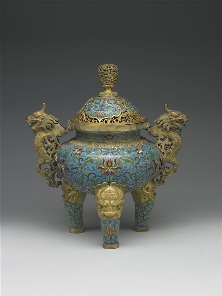 銅胎。直口,短頸,斜肩,雙螭形耳,圓腹,圓底,獸面三足,帶寶珠形鈕穹頂形子母口蓋。鍍金蓋鈕飾鏤空祥雲蝙蝠紋,蓋身飾鏤空番蓮紋,以掐絲琺瑯技法裝飾如意雲形開光,內有番蓮紋、如意雲紋及壽字,爐身以淺藍色為地,頸部飾花卉紋,肩部飾蓮瓣紋,腹部飾纏枝番蓮紋,底飾葵花紋,足部頂端飾張口獸首,足身飾番蓮紋及葵花紋。香爐為五供之一,本器與中琺266、267、271、273成套。