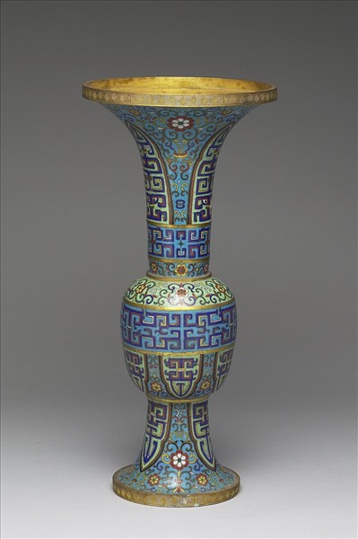 銅胎。撇口,長頸,足外撇。鍍金口沿及足飾回紋,以掐絲技法製作紋飾,全器淺藍地,頸、腹部飾有夔龍紋及蕉葉形開光,內飾夔龍紋,頸部有夔龍紋變形獸面紋,隙地飾纏枝六瓣花紋。底部露胎,有陰刻「乾隆年製」二行仿宋體雙方框款。瓶為五供之一,本器與中琺276-中琺280成套。
