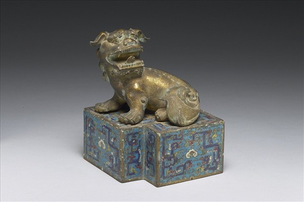 全器銅胎,由獅與台座組成。獅呈回首戲球狀,頸部掛有鈴鐺。台座為掐絲琺瑯方勝形高座,飾夔龍紋。