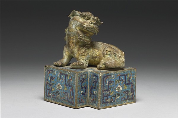 全器銅胎,由獅與台座組成。獅呈回首戲球狀,頸部掛有鈴鐺。台座為掐絲琺瑯方勝形高座,飾夔龍紋。
