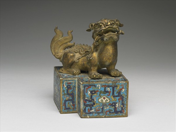 全器銅胎,由獅與台座組成。獅呈回首戲球狀,頸部掛有鈴鐺。台座為掐絲琺瑯方勝形高座,飾夔龍紋。