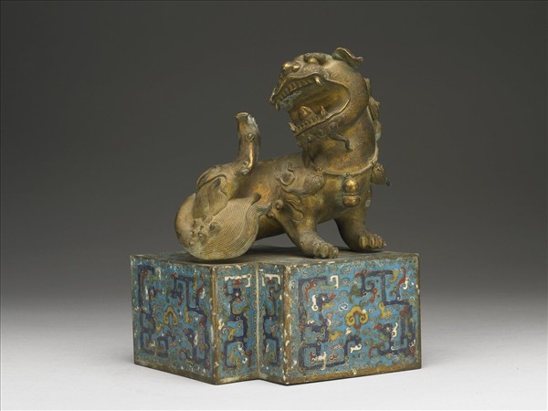 全器銅胎,由獅與台座組成。獅呈回首戲球狀,頸部掛有鈴鐺。台座為掐絲琺瑯方勝形高座,飾夔龍紋。