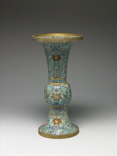 銅胎,仿青銅酒器觚的形制。喇叭口,鼓腹,高撇足。口緣與足皆鏨回紋一圈。器身淺藍地,以掐絲技法製作花紋,全器皆以番蓮紋與卷枝花葉紋為主要紋飾,另內壁亦見同樣紋飾。一般以燭台二、瓶二、香爐一同成五供,本器即五供的組成器之一。