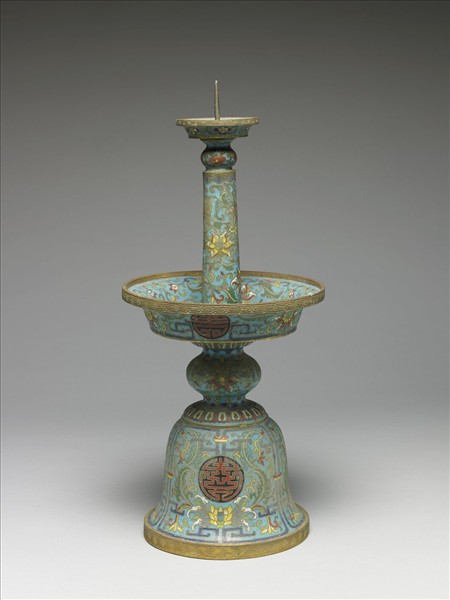 銅胎。由釘形燭阡,支柱、托盤及台座組成。器身藍地,以掐絲技法製作花紋。器外壁以掐絲番蓮紋為主要紋飾,但在托盤外壁以番蓮與圓形幾何化「壽」字相次排列為飾。另在台座面上,則每朵番蓮上方,皆配上一支圓形幾何化「壽」字,番蓮卷葉並屈伸圍拱在「壽」字兩側。一般以燭台二、瓶二、香爐一同成五供,本器即五供的組成器之一。
