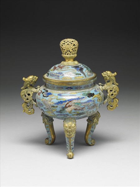 銅胎。直口,折邊,短直頸,碩腹,雕雙四足異獸為耳,三獸足。蓋上雕鏤卷枝番蓮為鈕。器身淺藍地,以掐絲技法製作花紋,頸部飾雲頭紋。蓋面與器外壁所用紋飾主題相同,為多色蝙蝠翔舞於彩雲間。獸足面上亦飾淺藍地掐絲彩雲。一般以燭台二、瓶二、香爐一同成五供,本器即五供的組成器之一。