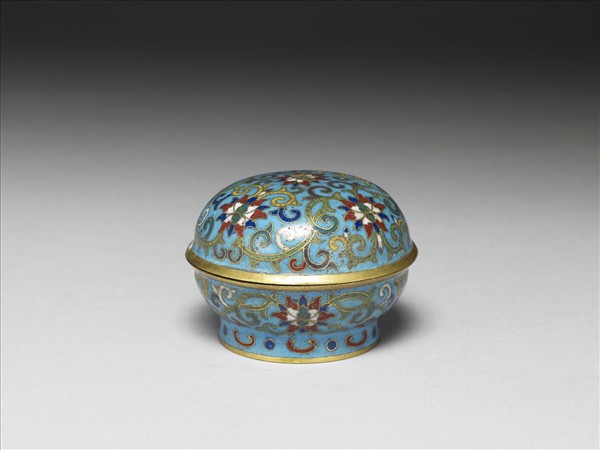 銅胎,子母口,深壁,圈足,帶圓頂蓋。器身藍地,以掐絲技法製作花紋,全器以纏枝番蓮紋為主要紋飾,足上飾如意紋,足內露胎,上刻「乾隆年製」四字楷款與「嘉」字楷款。本器與他件瓶、爐共成「爐瓶盒三件」。
