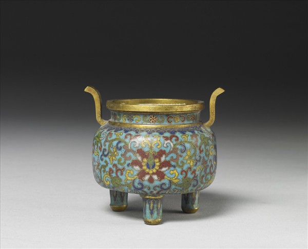 銅胎,圓口,短直頸,碩腹,雙立耳,三柱足。器身藍地,以掐絲技法製作花紋,頸部花卉,腹部上方如意雲頭紋一圈,腹壁則滿飾纏枝番蓮紋,底外捲枝花葉紋,又上露長方形胎,上刻「大清乾隆年製」六字楷款與「人」字楷款。本器與他件瓶、盒共成「爐瓶盒三件」。