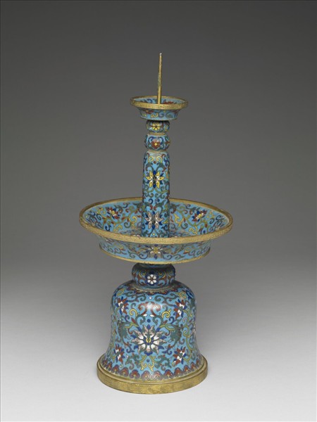 銅胎。由釘形燭阡,支柱,托盤及台座組成。器身藍地,以掐絲技法製作花紋,其全器飾番蓮紋與花卉紋,托盤口緣及台座下緣外側鏨飾回紋,台座上下如意雲紋邊飾各一圈。底外刻「乾隆年製」雙方框二行四字楷款。一般以燭台二、瓶二、香爐一同成五供,本器即五供的組成器之一。
