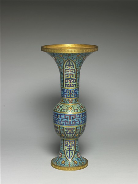 銅胎。撇口,長頸,足外撇。鍍金口沿及足飾回紋,以掐絲技法製作紋飾,全器為淺藍地及淺綠色地,頸、腹部飾有夔龍紋及蕉葉形開光,內飾夔龍紋,頸部有夔龍紋變形獸面紋,隙地飾纏枝六瓣花紋。底部露胎,底有陰刻「乾隆年製」雙行雙方框楷款。本器與中琺325成對。