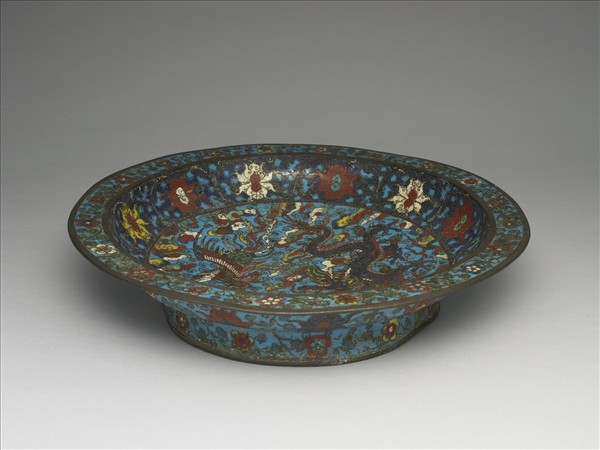 銅胎,侈口,折沿,淺壁,平底,圈足。全器藍地,折沿面、背及圈足均飾五瓣花紋,內、外壁及外底飾轉枝番蓮紋,內底為雲紋錦地飾龍、鳳及火球紋。