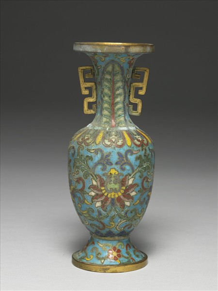 銅胎,侈口,立沿,長頸,雙耳,斜肩,斂腹,外撇圈足。全器淺藍地,頸飾蕉葉紋及五瓣花紋,肩部飾蓮瓣紋,腹部為番蓮花紋,圈足飾六瓣花紋。