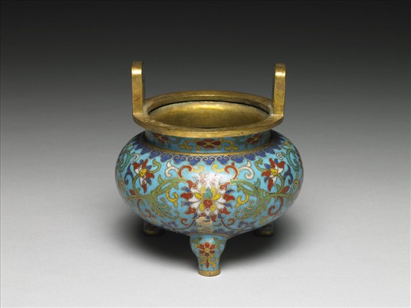 銅胎,直口,折沿,立耳,短頸,圓腹,三足。器表淺藍地,頸部及足部飾朵花紋,腹部飾番蓮紋,邊緣飾如意雲紋,底飾六瓣花紋。底部方形鍍金陰刻「乾隆年製」橫向四字單行楷款及一「肥」字。本件與他件瓶、盒共成「爐瓶盒」一組。