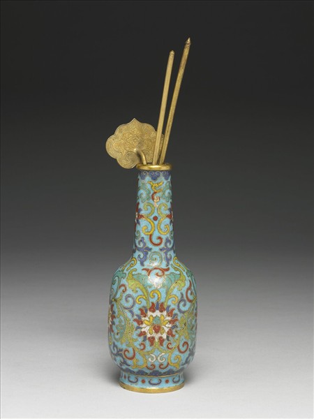 銅胎,直口,長頸,斜肩,直長腹,圈足。全器淺藍地,主飾纏枝番蓮紋,口緣及腹部下緣有如意雲紋,圈足部飾如意點紋。附如意雲形回紋邊花卉紋銅鏟一支、銅箸一雙,底部鍍金陰刻「乾隆年製」橫向四字單行楷款及一「肥」字。本件與他件爐、盒共成「爐瓶盒」一組。