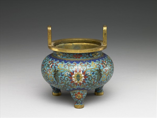銅胎,直口,折沿,立耳,短頸,圓腹,三足。器表淺藍地,頸部及足部飾朵花紋,腹部飾番蓮紋,邊緣飾如意雲紋,底飾六瓣花紋。底部方形鍍金陰刻「乾隆年製」橫向四字單行楷款及一「貽」字。本件與他件瓶、盒共成「爐瓶盒」一組。