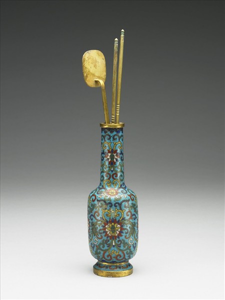 銅胎,直口,長頸,斜肩,直長腹,圈足。全器淺藍地,飾纏枝番蓮紋及六瓣花紋,口緣及腹部下緣有如意雲紋,圈足部飾如意點紋。附圓角長方形銅鏟一支、銅箸一雙,底部鍍金陰刻「乾隆年製」橫向四字單行楷款及一「貽」字。本件與他件爐、盒共成「爐瓶盒」一組。