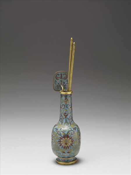 銅胎,直口,長頸,斜肩,直長腹,圈足。全器淺藍地,飾纏枝番蓮紋,口緣及腹部下緣有如意雲紋,圈足部飾如意點紋。附圓角長方形蝙蝠番蓮紋銅鏟一支、銅箸一雙,底部鍍金陰刻「乾隆年製」橫向四字單行楷款及一「貽」字。本件與他件爐、盒共成「爐瓶盒」一組。