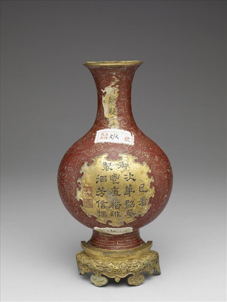 銅胎,前面為侈口長頸圓腹外撇足瓶,連接浮雕式壽字雲龍紋如意雲足座,靠牆面平,頸下方有一孔可以直接掛在牆面的釘上,故稱壁瓶,清檔中稱之轎瓶。此型器始見於明萬曆朝,清代盛行於乾隆時期。此瓶紅地,器身飾掐絲卷草紋,腹部開光鍍金地填「御製」二字及詩文「已看次第韶華鬯,底藉徘徊芳信探。」落「臣于敏中」紅地陰文印、「以寫葵心」鍍金地陽文填紅字,足部飾掐絲回紋。于敏中(1714-1782),乾隆二年(1737)中狀元,工書法,歷官文華殿大學士,二十五年(1760)入懋勤殿奉敕寫華嚴經寶塔,廷論多出其手。