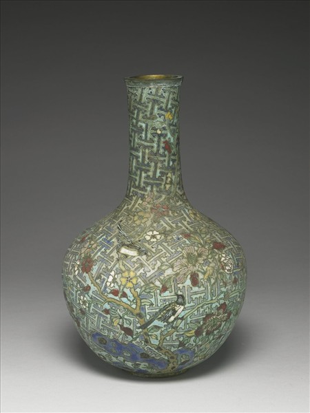 微撇口,長頸,斜肩,圓腹,圈足。全器以掐絲技法裝飾,淺藍底藍色雷紋錦地,蓮花、梅花、蘭花、喜鵲、蝴蝶、山石、靈芝,口沿飾回紋,底部露胎,無款。