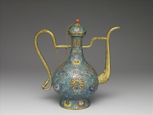 子母口,長頸,斜肩,圓腹,外撇圈足,曲流,彎把,帶紅色珊瑚球鈕圓頂蓋,以銅鏈與壺把相連。除頸部飾蕉葉紋及花卉紋外,腹部飾淺藍地掐絲琺瑯轉枝番蓮花紋,流及把露胎,流口沿雕飾回紋,流底飾張口龍首,流與壺間有一龍趕珠連接管飾,提把連接壺處鑄飾龍首,高處飾朵花紋紅花心嵌珊瑚,把尾上鉤作如意雲紋裝飾。壺底有去地陽文「乾隆年製」四字雙行楷書方形鑄款。