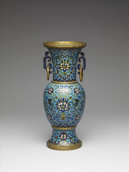 銅胎,直口,斜長頸,雙雲形帶環耳,圓肩,斂腹,外撇圈足。全器飾淺藍地轉枝番蓮花紋,頸、腹、足相接處飾如意雲形紋。底部露胎,有陰刻「乾隆年製」四字雙行雙方框楷款。與中琺357為一對,中琺356、357、358、359、360為一組。