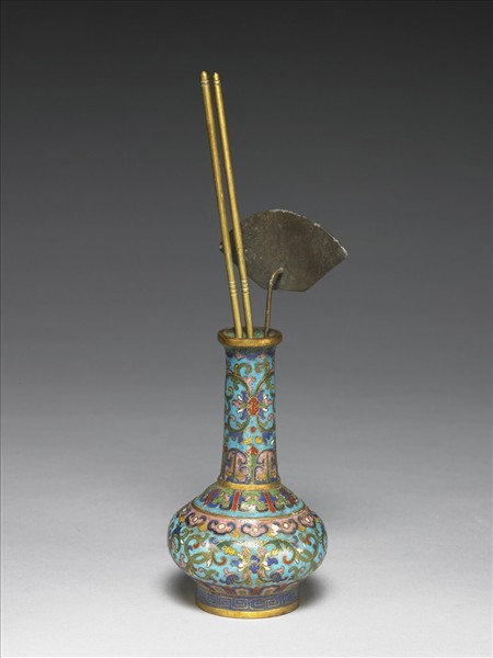 直口,長直頸,溜肩,鼓腹,圈足。器內施淺藍釉,器表淺藍地,以掐絲技法於口緣飾如意雲紋,頸飾轉枝草葉紋,肩與腹底飾蓮瓣紋,腹上方飾如意雲紋,腹面為轉枝草葉紋,圈足飾回文。附銅鏟一,銅箸一雙。中琺361、362、363為一組。