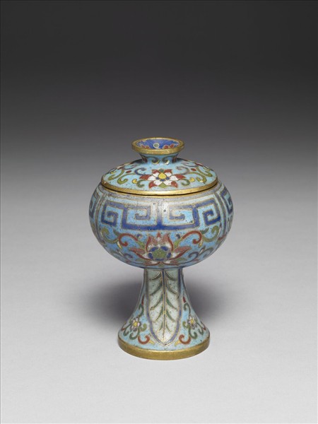 圓形斂口,深壁,外撇圈足,圓形蓋,撇圈足鈕。仿自古代豆形器,鈕內為深藍地並飾朵花紋。器表淺藍地,以掐絲技法於蓋與腹飾番蓮紋,口緣飾回文,足為蕉葉紋與折枝五瓣花紋。