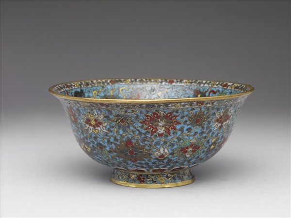 銅胎侈口碗。通體施淺藍色釉, 碗心有天馬馳騁於洶湧波濤與五彩祥雲間,開光外環一圈蓮瓣紋。碗內壁有釉色不一之六獅戲球。碗外飾纏枝俯仰蓮紋。碗底光素鍍金。此器紋飾生動,釉色典雅, 製作年代應在十六世紀中期以前。