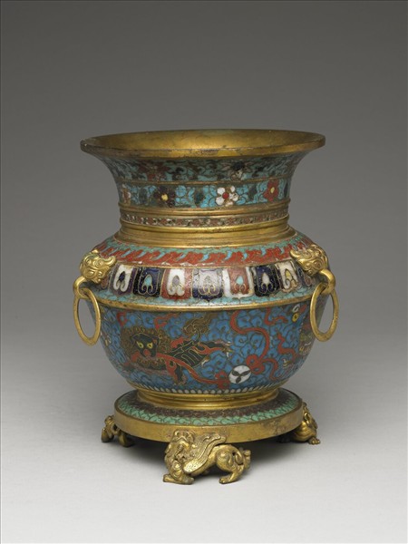 撇口,直頸,斜肩,斂腹,平底,圓形座,肩處有三環,座下附三狻狔形足。頸與肩部施淺藍釉,器腹深藍,頸底一圈白地,底座綠地。以掐絲技法於頸部飾轉枝番蓮紋與二圈五瓣花紋,肩為俯蓮瓣紋,腹飾雲紋錦地並有獸與皮球花紋飾,腹底一圈花瓣紋,底座為兩圈雲紋錦地。底鍍金,中央刻有羯磨杵紋。