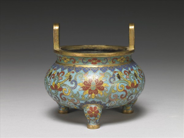 鍍金口,短頸,圓腹,雙立耳,三足。器表淺藍地,以掐絲技法於頸部飾海棠紋,腹部飾番蓮紋,腹上緣及足頂飾一圈如意雲紋,足部飾葵花紋。底部方形露胎陰刻「乾隆年製」橫向四字單行楷款及一「仕」字。中琺373、374、375為一組。