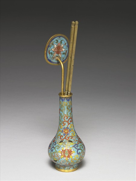 鍍金口,長頸,斜肩,圓腹,圈足。全器淺藍地,以掐絲技法於器表飾六瓣花紋與番蓮紋,口緣及腹底飾如意雲紋,足部飾幾何紋。附番蓮紋銅鏟一銅箸一雙。底部圓形露胎陰刻「乾隆年製」橫向四字單行楷款及一「仕」字。中琺373、374、375為一組。