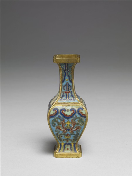 方形口,直長頸,斜肩,斂腹,方形撇足。器表淺藍地,以掐絲技法於頸部飾蕉葉紋與拐子龍紋,肩飾如意雲紋,腹為卷草紋,足為仰蓮瓣紋。中琺379、380、381為一組。