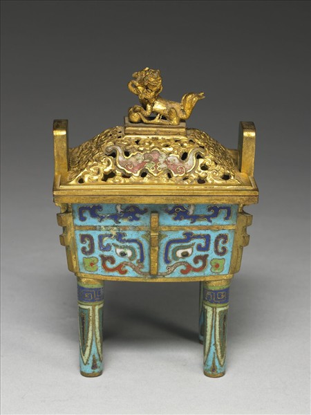 四方形,鍍金口,雙立耳,深壁,平底,四足,四角與四面各有一棱脊,梯形蓋,獅戲球鈕。蓋為鏤空雲錦紋並飾兩蝙蝠。全器淺藍地,以掐絲技法於雙耳飾回文,口緣為拐子龍紋,腹部飾獸面紋,足部飾深藍地回紋及俯蓮瓣紋。中琺388、389、390為一組。