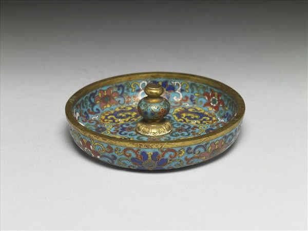 銅胎,廣口,弧壁,平底,中央立蓮瓣座葫蘆形香插,口緣鍍金。器內外皆為淺藍地,以掐絲技法製作花紋,內底有四個黃地開光,內飾龍紋,器內外壁均飾番蓮紋。外底飾四朵紅色番蓮圍繞一圓形鍍金面,內刻「乾隆年製」四字楷款。