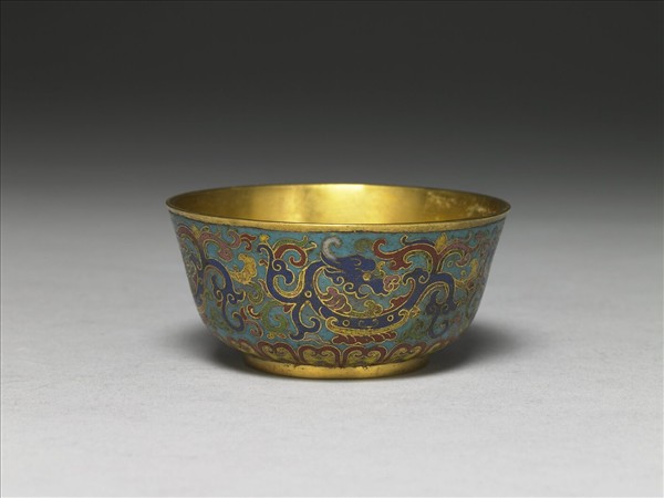 銅胎,口略侈,垂腹,圈足小碗。碗內鍍金,器外淺藍地飾回首夔龍四,腹下方飾一圈仰蓮瓣。器底陰刻「大清乾隆年製」雙方框楷書款。一式十個碗裝成一屜,屜中每格有榫頭鎖住。