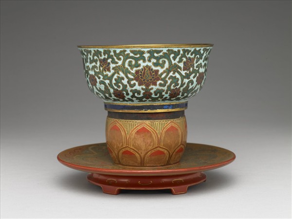 銅胎,侈口,深弧壁,圈足。器內壁鍍金,器外壁淺藍地,飾掐絲纏枝番蓮紋和花卉紋,花以紅藍二色填飾,枝葉則略顯粗重,其或正面展開,或轉側延展,滿飾壁面。圈足鍍金夾藍色釉一圈。附漆托盤。