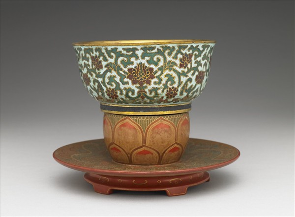 銅胎,侈口,深弧壁,圈足。器內壁鍍金,器外壁淺藍地,飾掐絲纏枝番蓮紋和花卉紋,花以紅藍二色填飾,枝葉則略顯粗重,其或正面展開,或轉側延展,滿飾壁面。圈足鍍金夾藍色釉一圈。附漆托盤。