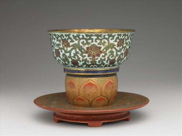 銅胎,侈口,深弧壁,圈足。器內壁鍍金,器外壁淺藍地,飾掐絲纏枝番蓮紋和花卉紋,花以紅藍二色填飾,枝葉則略顯粗重,其或正面展開,或轉側延展,滿飾壁面。圈足鍍金夾藍色釉一圈。附漆托盤。