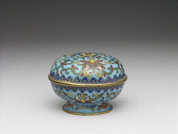 銅胎,子母口,弧壁,圈足外撇,帶圓頂蓋。器內施藍釉,器表淺藍地,以掐絲技法製作花紋,蓋頂花卉圖案一朵,周圍與盒身以纏枝番蓮花葉為主要紋飾,口緣與蓋沿各有深藍色如意雲紋一周,圈足飾卷枝花卉。本器與他件爐、瓶共成「爐瓶盒一組」。