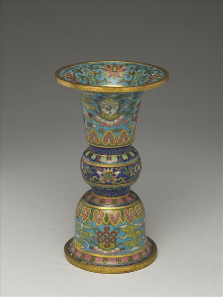 銅胎,喇叭口,鼓腹,高撇圈足,仿古代青銅器觚的形制。器表除腹部外為淺藍地,口頸內壁飾纏枝番蓮紋,腹深藍地飾卷草、蓮瓣與番蓮紋,口頸與足牆外壁主要為各色雲紋,間飾蓮托八寶。底外鍍金刻雙圈「乾隆年製」四字楷款。此器一式兩件,同成一組。