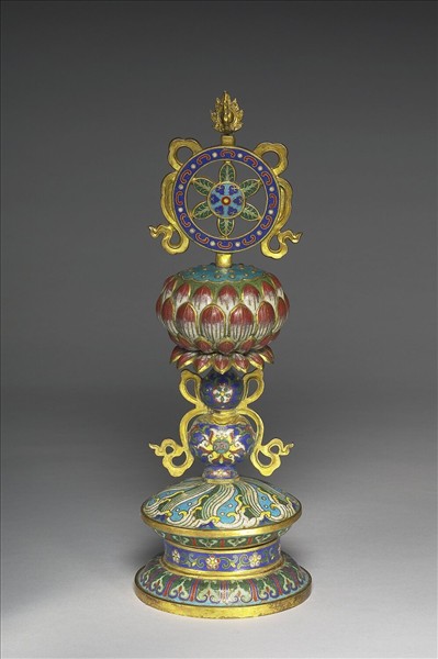 清宮作品,十八世紀。八吉祥是法輪、寶螺、幢傘、寶蓋、蓮花、水罐、雙魚、盤長結等。此八者為佛教中八種吉祥寶物,又稱八寶,每一項都可單獨成為佛陀的符號。本組八吉祥供具,係托盛在寶瓶蓮花檠座上,以銅胎掐絲琺瑯製作,工緻精美。本件法輪象徵佛法圓滿、旋轉不息。