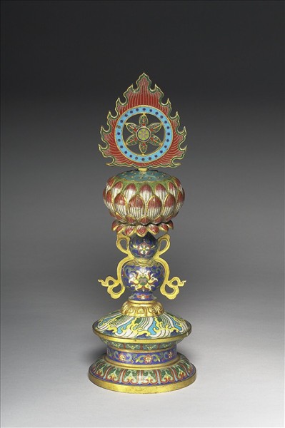 清宮作品,十八世紀。八吉祥是法輪、寶螺、幢傘、寶蓋、蓮花、水罐、雙魚、盤長結等。此八者為佛教中八種吉祥寶物,又稱八寶,每一項都可單獨成為佛陀的符號。本組八吉祥供具,係托盛在寶瓶蓮花檠座上,以銅胎掐絲琺瑯製作,工緻精美。本件法輪象徵佛法圓滿、旋轉不息。