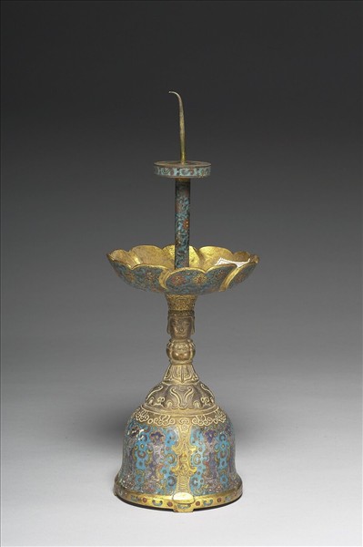 銅胎。由釘形燭阡,支柱,承盤及台座組成,台座下附四方足。器表淺藍地,以掐絲技法製作花紋。承盤作六瓣花形,外壁滿飾番蓮紋,台座等分為四開光,開光內各飾變形夔龍兩隻,台座上支柱雕為人形站立,頭頂上方承盤。燭台為五供之一。