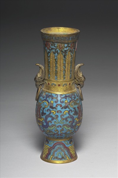 銅胎。侈口,長頸,碩腹,高撇圈足,器側鑲雙鳳耳帶活環。器表淺藍地,主要以掐絲技法製作花紋,口緣飾回紋,頸部番蓮紋,並鏨刻蕉葉為飾,腹部番蓮紋,足上如意雲頭紋。頸、腹間鏨有如意點紋,內填飾紅藍琺瑯彩。附銅膽。瓶為五供之一。